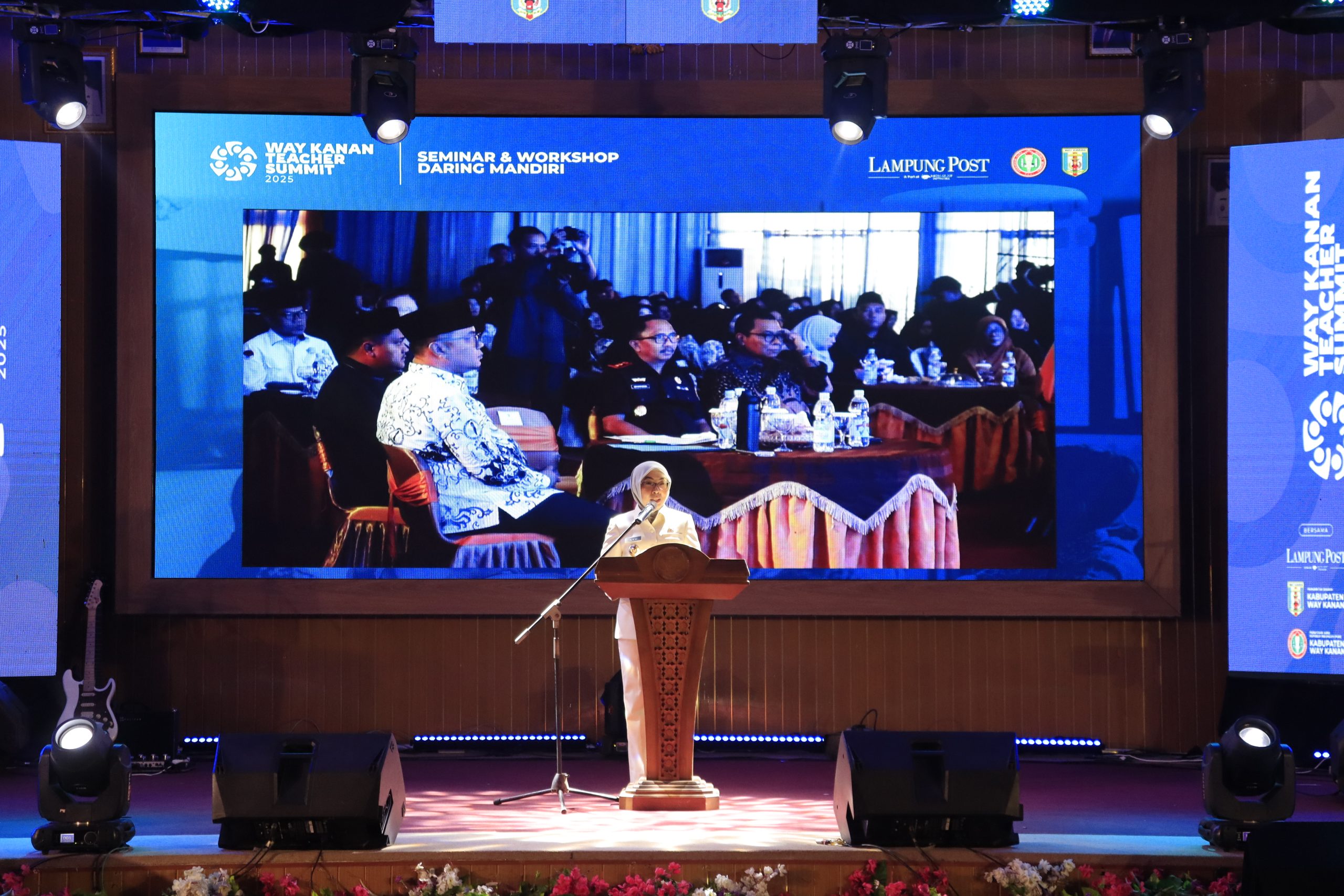 Sebelumnya, Sekretaris Daerah Kabupaten Way Kanan, Machiavelli Herman Tarmizi, S.STP., M.Si., selaku Ketua PGRI Kabupaten Way Kanan, menyampaikan bahwa Seminar dan Workshop Teacher Summit 2025 dilaksanakan pada 24–25 November 2025 dan diikuti lebih dari 3.000 guru dari berbagai jenjang pendidikan, baik melalui metode daring maupun luring.