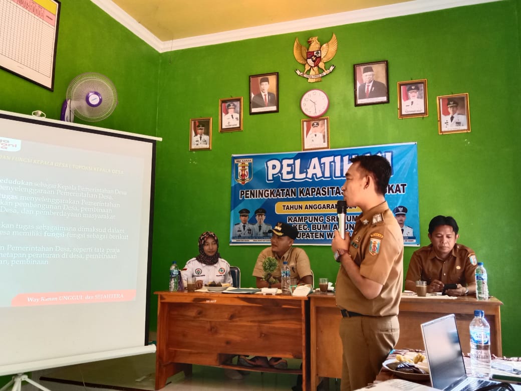Sekcam Bumi Agung Indra, S.E., M.M., Menyampaikan Berdasarkan Peraturan Pemerintah Nomor 72 Tahun 2005 tentang Desa, tugas pokok dan fungsi Kepala Desa beserta aparatnya dalam menyelenggarakan pemerintahan Desa, melaksanakan pembangunan dan pelayanan,maka hari ini Kampu Srinumpi Melaksanakan Pelatihan Peningkatan Kapasitas Perangkat Kampung.