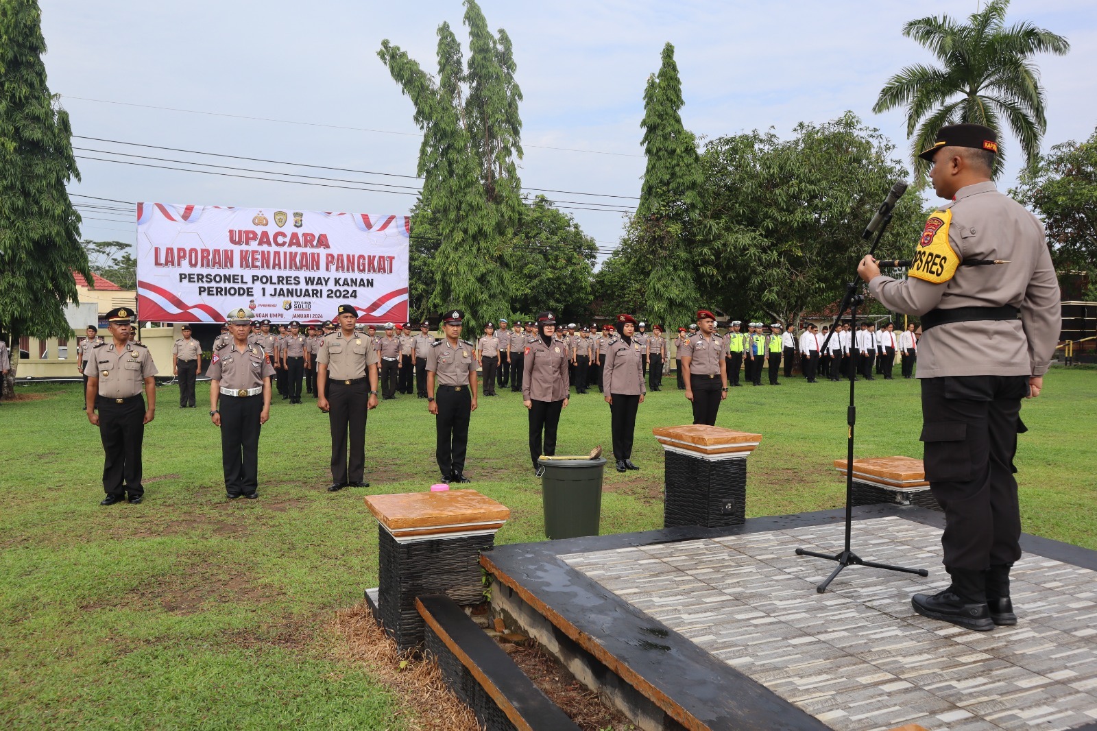 Dalam amanatnya Kapolres Way Kanan AKBP Pratomo Widodo menyampaikan marilah kita mengucap syukur kepada Tuhan Yang Maha Esa Allah Swt karena pada hari ini di awal tahun 2024, kita semua masih bisa berdiri di tempat ini.Semua itu, oleh karunia nya yang telah diberikan kepada kita berupa kekuatan dan kenikmatan serta kesempatan, untuk bisa melaksanakan upacara laporan kenaikan pangkat personel Polres Way Kanan periode 1 januari 2024.
