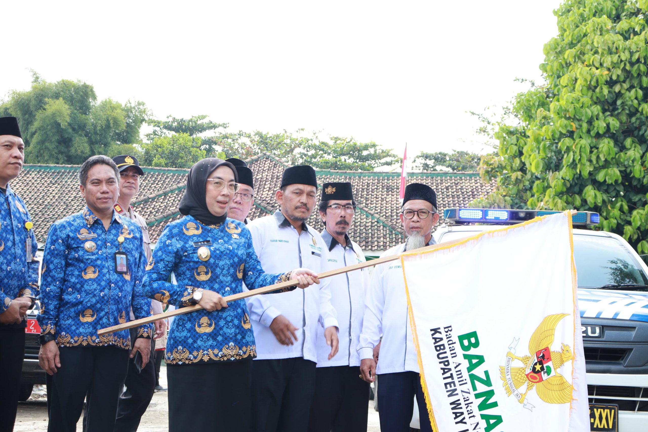 Pelaksana Tugas (Plt.) Bupati Way Kanan, Ayu Asalasiyah, S.Ked., didampingi Asisten Bidang Pemerintahan dan Kesejahteraan Rakyat, Ketua Badan Amil Zakat Nasional (Baznas), serta Kepala Bagian Kesejahteraan Rakyat Sekretariat Daerah Kabupaten Way Kanan, secara resmi melepas distribusi logistik sembako Ramadhan 1446 H di halaman Kantor Baznas Way Kanan, Senin (17/03/2025).