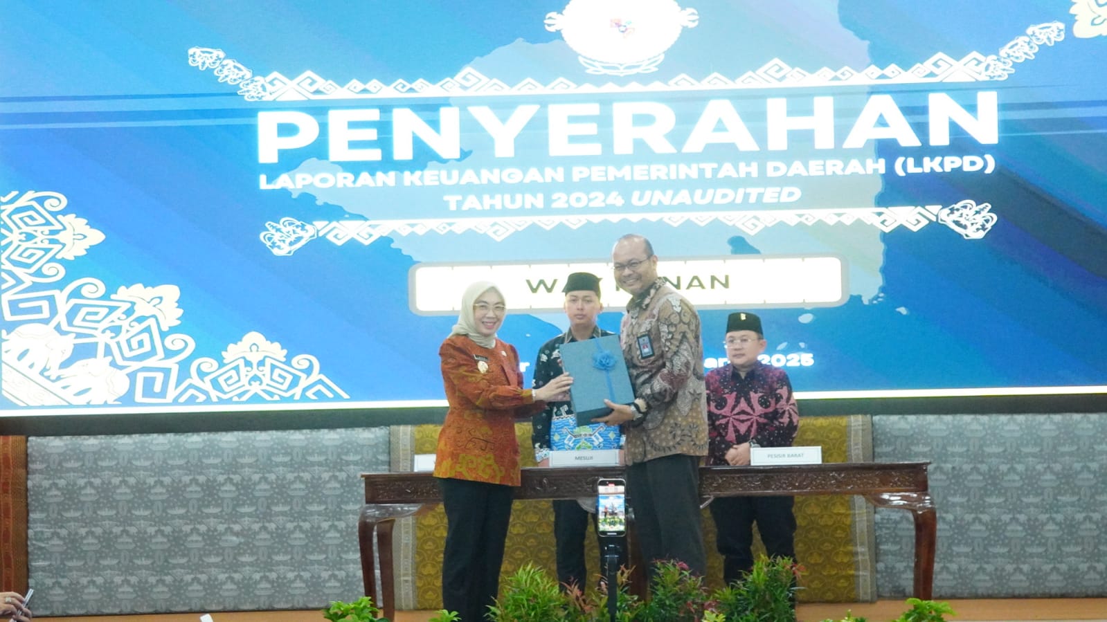 Pelaksana Tugas (Plt) Bupati Way Kanan, Ayu Asalasiyah, S.Ked bersama Penjabat (Pj) Sekretaris Daerah Kabupaten, Dr. Arie Anthony Thamrin, S.STP.,M.IP.,CGCAE.,CGRE menghadiri Penyerahan Laporan Keuangan Pemerintah Daerah (LKPD) Unaudited Tahun 2024 di Ruang Auditorium Kantor BPK Perwakilan Provinsi Lampung, Kamis (27/03/2025).